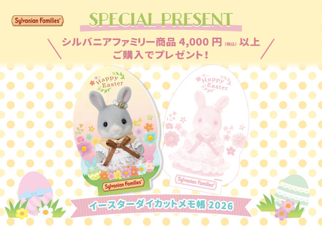 概要 / 期間中、シルバニアファミリー商品4,000円(税込)以上のご購入で、「イースターダイカットメモ帳2026」をおひとつプレゼントいたします。