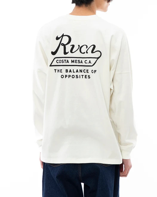 左胸と背面に、RVCAのスクリプトロゴとステートメント「BALANCE OF OPPOSITES」を組み合わせたロゴが