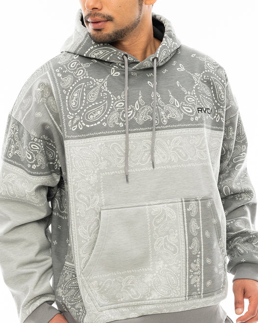 トーンの異なるバンダナ柄を組み合わせ、パッチワークデザインで仕上げたプルオーバーフーディーとパンツ。